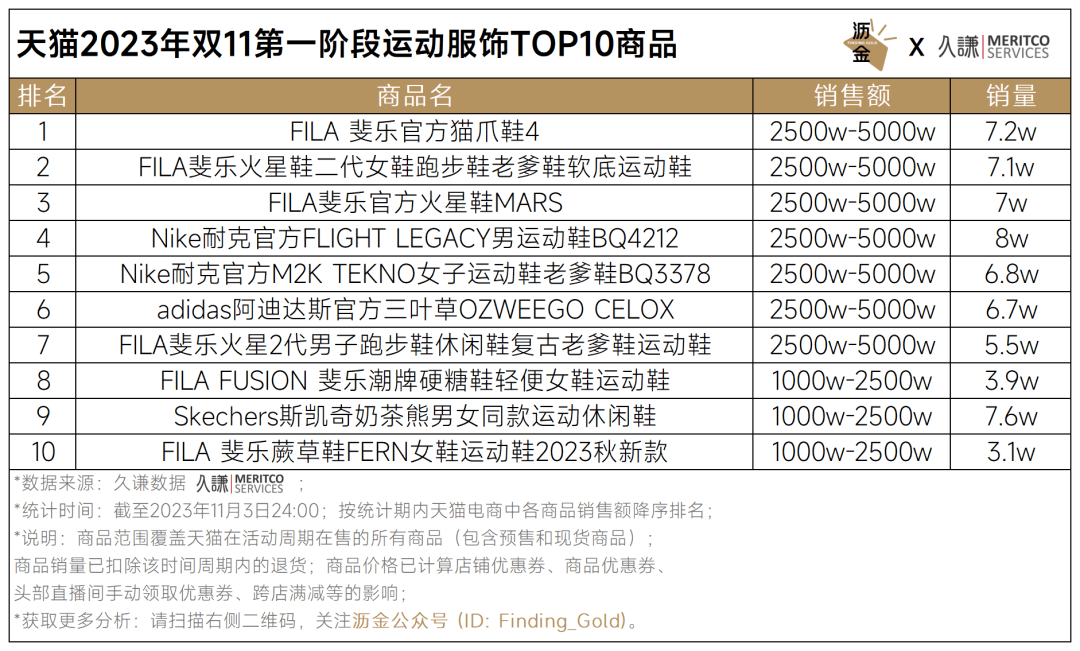 TOP10商品榜单被鞋类产品霸榜,其中斐乐占6席,仅榜单统计销售额就超1.8亿元。纵观商品榜单可以看出,复古老爹鞋占多数,复古运动美学仍是主流。