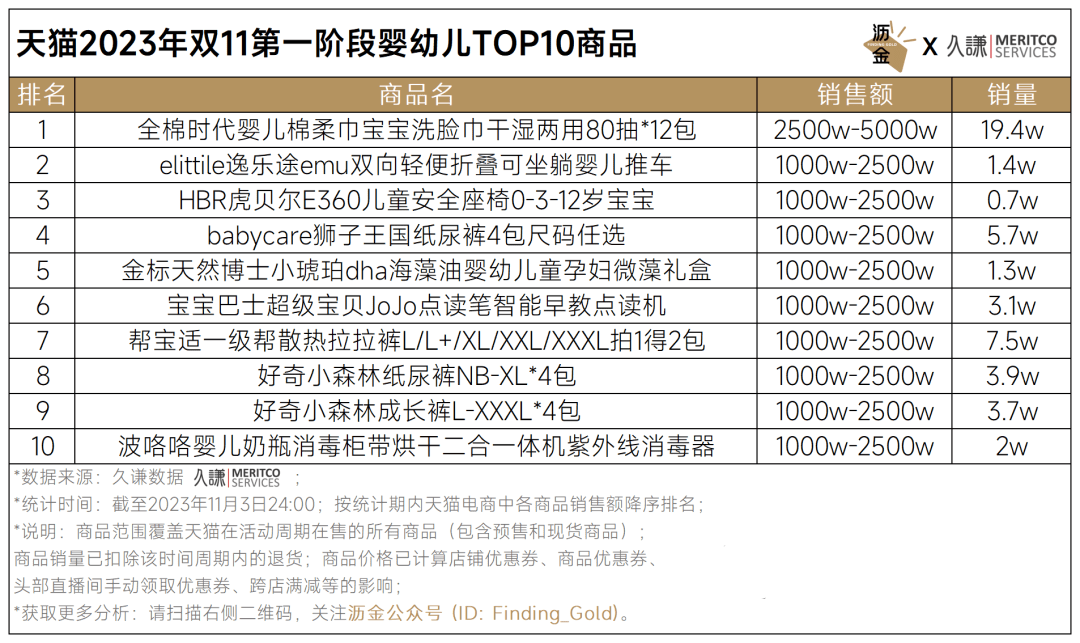 从TOP10商品榜来看,棉柔巾和纸尿裤等婴幼儿消耗品占多数。这些产品的销量远高于其他类型的单品,说明消费者对婴幼儿的日常护理需求非常关注。此外,婴儿推车、安全座椅以及次级需求的营养品和早教机也进入榜单前十。这表明除了婴幼儿的日常护理需求外,婴幼儿的出行安全、健康饮食和教育等也具有较大市场需求。