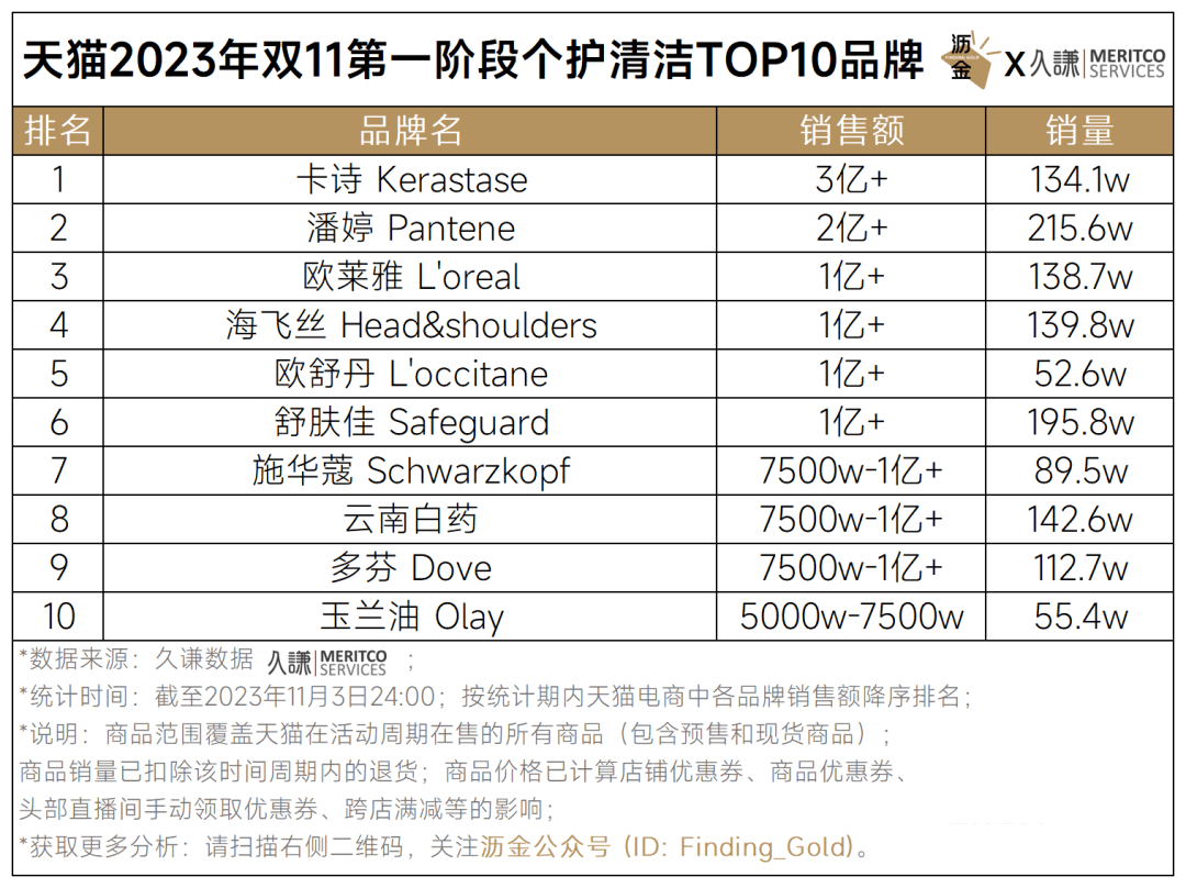 个护清洁类目的TOP10品牌榜中,欧莱雅和宝洁两大巨头优势明显,旗下品牌占比过半;卡诗以超3亿的销售额位居榜首,潘婷凭215.6万的超高销量位居榜二;榜单前十仅云南白药一个国货品牌。