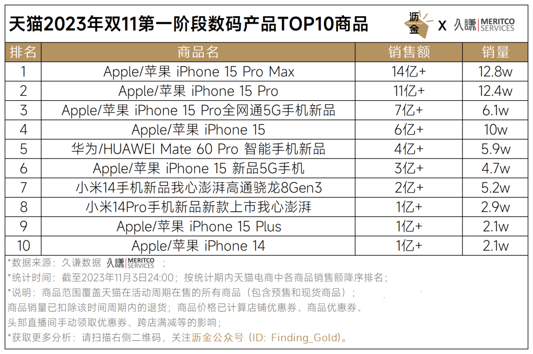 TOP10商品榜中,苹果手机占7席,iPhone15系列仅榜单统计销售额就超40亿。其余则是华为、小米在双11开售前发布的新品系列手机。