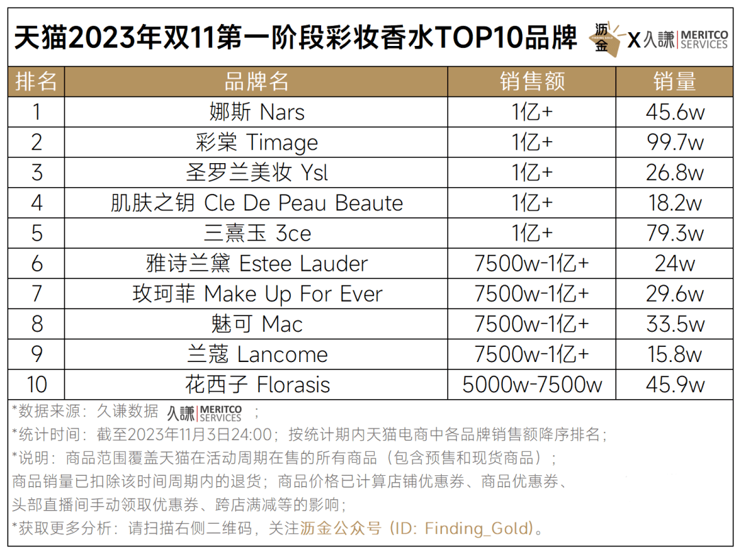 再看彩妆香水品类,TOP10品牌中,娜斯、彩棠、圣罗兰等前五个品牌销售额均超1亿元。其中,彩棠、花西子两大国货彩妆品牌进入榜单前十,且彩棠凭借99.7万的销量居榜二,国货彩妆增长趋势明显。