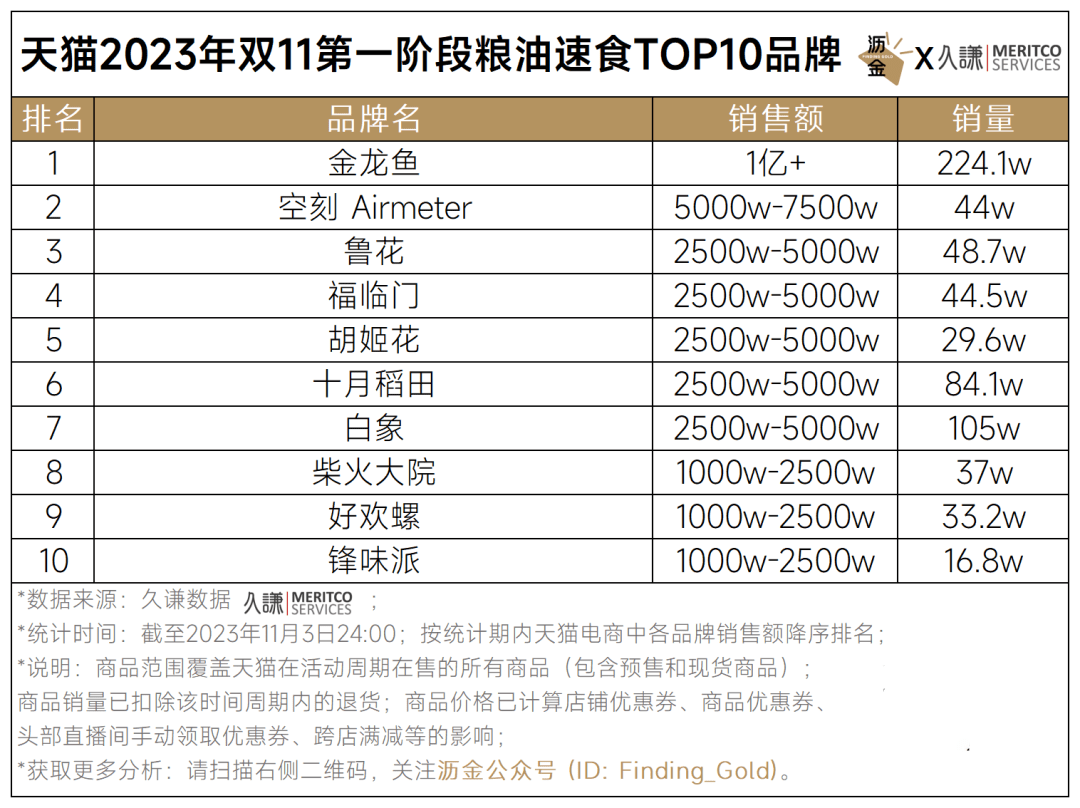 粮油速食TOP10品牌榜中,金龙鱼以超过1亿的销售额和224.1的销量夺得桂冠;空刻、鲁花和福临门紧随其后。榜单内几乎全是国货品牌,可见国货品牌更懂国人口味偏好。
