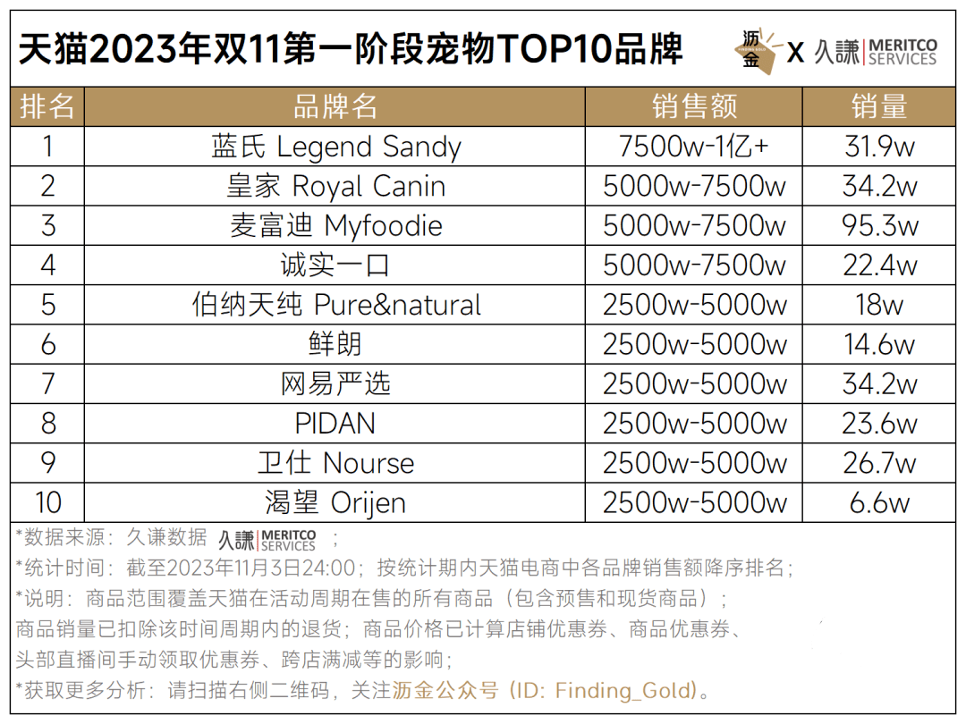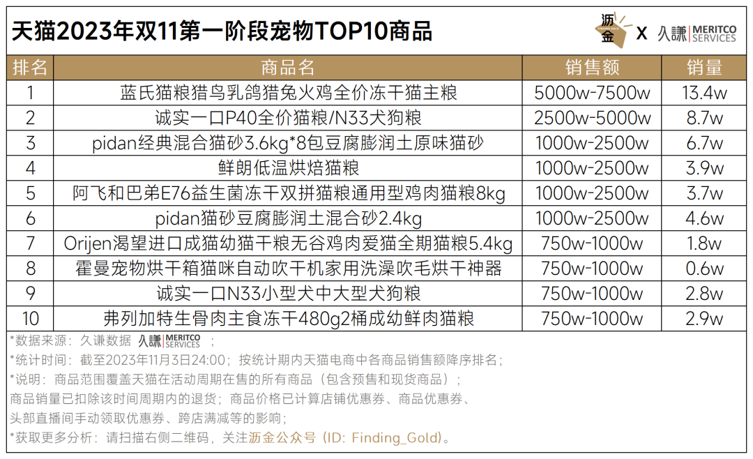 从热销商品榜来看,粮类产品仍然是销售主力军,其中猫粮占据了6个席位。此外,两款猫砂的销售额和销量也排名靠前,这说明猫咪用品的需求量较大,品牌可以在这方面重点布局。