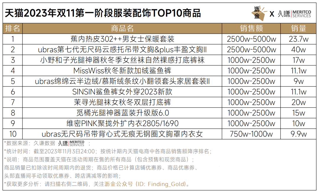 TOP10商品榜中,秋冬单品占七成,其中蕉内保暖套装居于榜首,主打热皮空气锁温、抗菌抗静电卖点。此外,Ubras有三款产品上榜,榜内合计销售额超6000万。值得关注的是今年刚成立的黑马品牌MissWiss,凭借销售额破千万的爆款鲨鱼裤出现在类目商品榜前十。