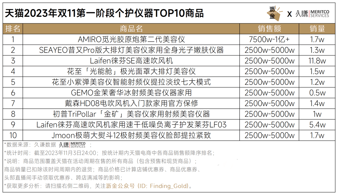 热销商品榜单中,美容仪占据七成,成为个护仪器类目销售的主力军,这说明该类目市场需求较大,品牌可在该类目重点发力。