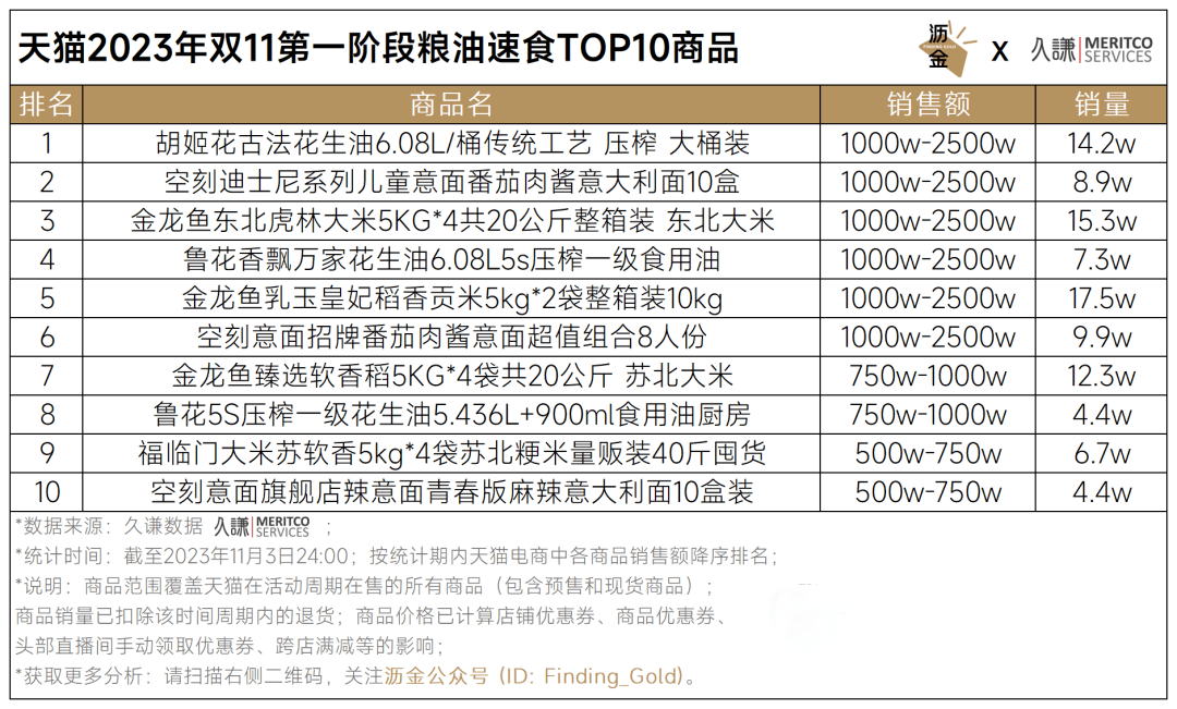 在TOP10商品榜中,大米占4席,食用油占3席,剩下的三个席位都被空刻占领。本次上榜商品多为整箱装、量贩装,符合大促期间消费者的囤货心智。