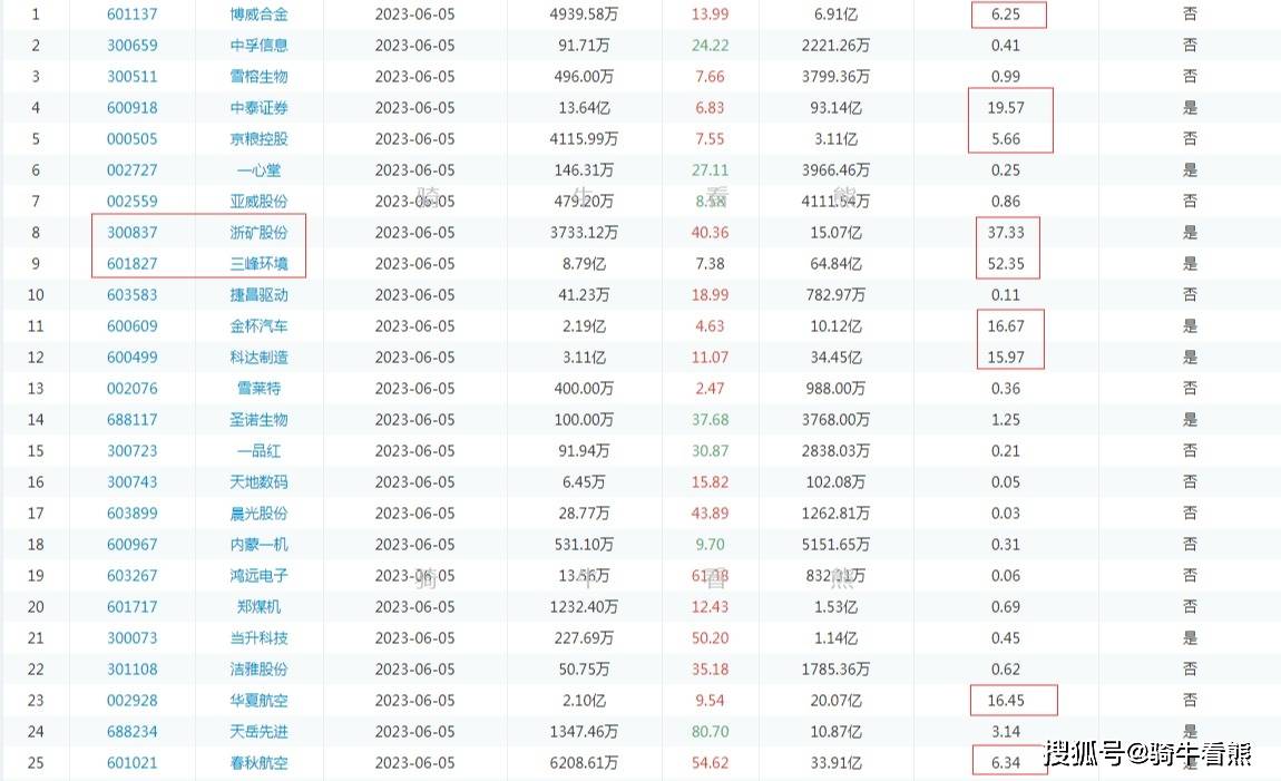 上面的图表中解禁比例大于5%的股票:博威合金、中泰证券、京粮控股、浙矿股份、三峰环境、金杯汽车、怡球资源、科达制造、华夏航空、春秋航空、汉鑫科技、大禹生物、鹏鹞环保、中钢洛耐、井松智能、东利机械、翔楼新材、铖昌科技、明冠新材、南网储能、麟盛科技、智慧农业、迈赫股份、中化国际、科达自控、国机重装、燕麦科技、浙江力诺、昱能科技、华海清科、腾亚精工、博众精工、松井股份、湘财股份、凯立新材、荣亿精密、泉峰汽车。