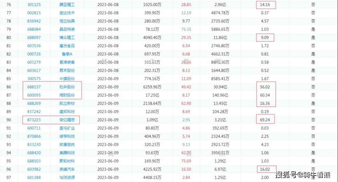 6月9日(周五)松井股份解禁比例达到56.02%;湘财股份解禁比例达到60.34%;荣亿精密解禁比例达到69.24%。