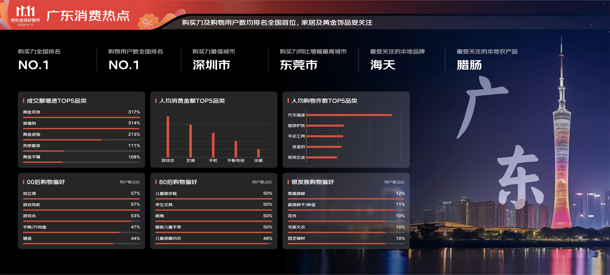 从细分品类来看,游戏本、空调、手机、平板电脑、冰箱成为广东人均消费金额排名前五的品类;开关插座、面部护肤、手动工具、低温奶、家用五金是人均购物件数排名前五的品类。从成交额增速来看,黄金耳饰、美缝剂、黄金戒指、洗烘套餐、黄金手镯是广东省成交额增速前五的品类,成交额增速分别为317%、314%、213%、111%、108%。