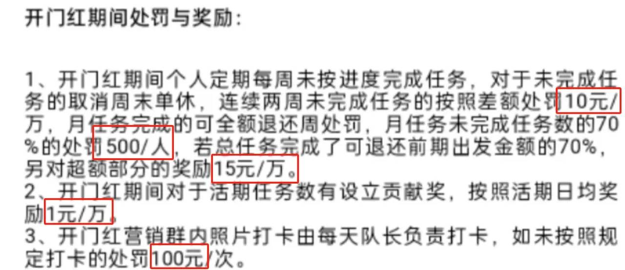 这个开门红期间处罚与奖励,没有完成任务的取消周末单休,即使单休都被取消了,变成了周末无休;同时对没有完成任务以差额万分之10、15进行处罚,而奖励只有万分之1,对超额完成任务才有万分之15。更重要的是还要求每天群内打卡,少打卡一次处罚100元。