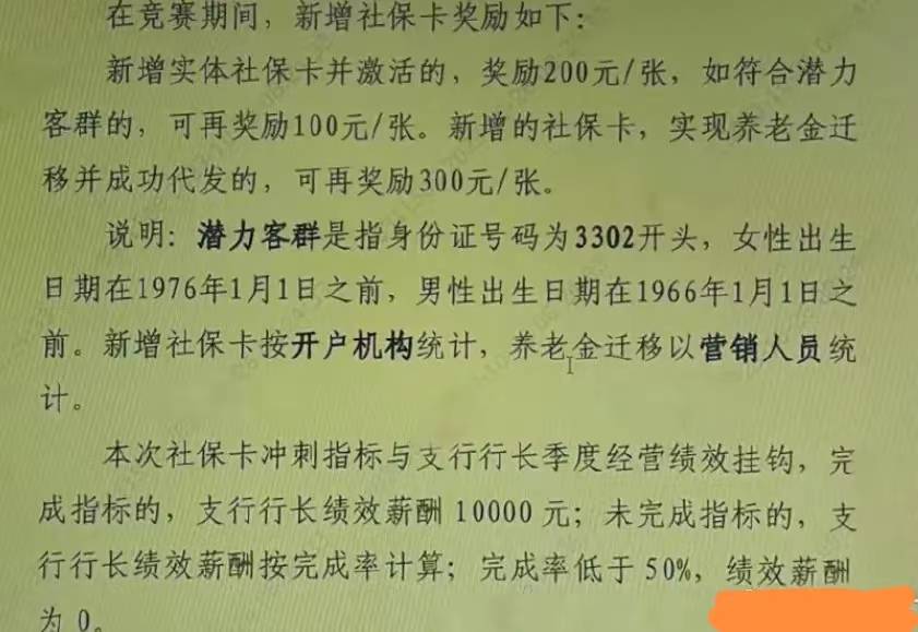 一位银行网友晒出自己银行的新增社保卡竞赛通知,给人冲击大的不是新增一张社保卡并激活奖励200元,也不是新增社保卡实现养老金迁移并成功代发再奖励300元;而是对支行长的奖惩:新增社保卡完成情况与支行长的季度绩效挂钩,完成冲刺指标支行长的绩效1000元;未完成指标的绩效按完成比率进行计算;而如果支行指标完成率低于50%,支行长绩效薪酬为零!
