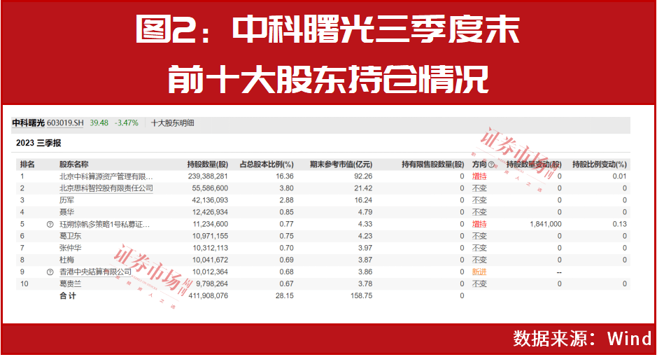 如算力概念股中科曙光,截至三季度末, 葛卫东对其持仓1097万股(见图2)。安信证券分析师赵阳对中科曙光发布了买入评级,并给出了49.77元的目标价,而截至本周末,公司收盘价为39.48元,距离目标价有26.06%的上行空间。赵阳表示,中科曙光作为核心信息基础设施领军企业,有望受益于人工智能浪潮下带来的算力需求激增,且作为海光的第一大股东也有望借此受益。