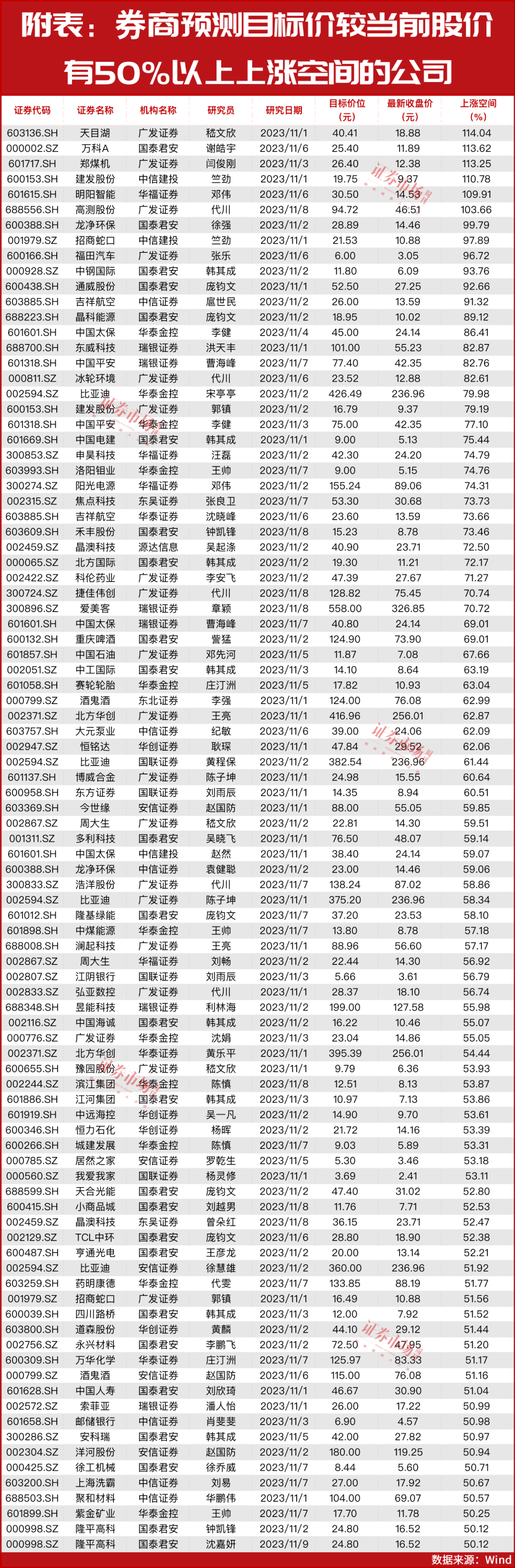 统计11月以来各大券商对上市企业发布的买入评级报告,其中595家公司被给出了明确的目标价,将公司最新收盘价与目标价进行对比,有78家公司券商预判未来股价有望较当前上涨超50%(见附表)。