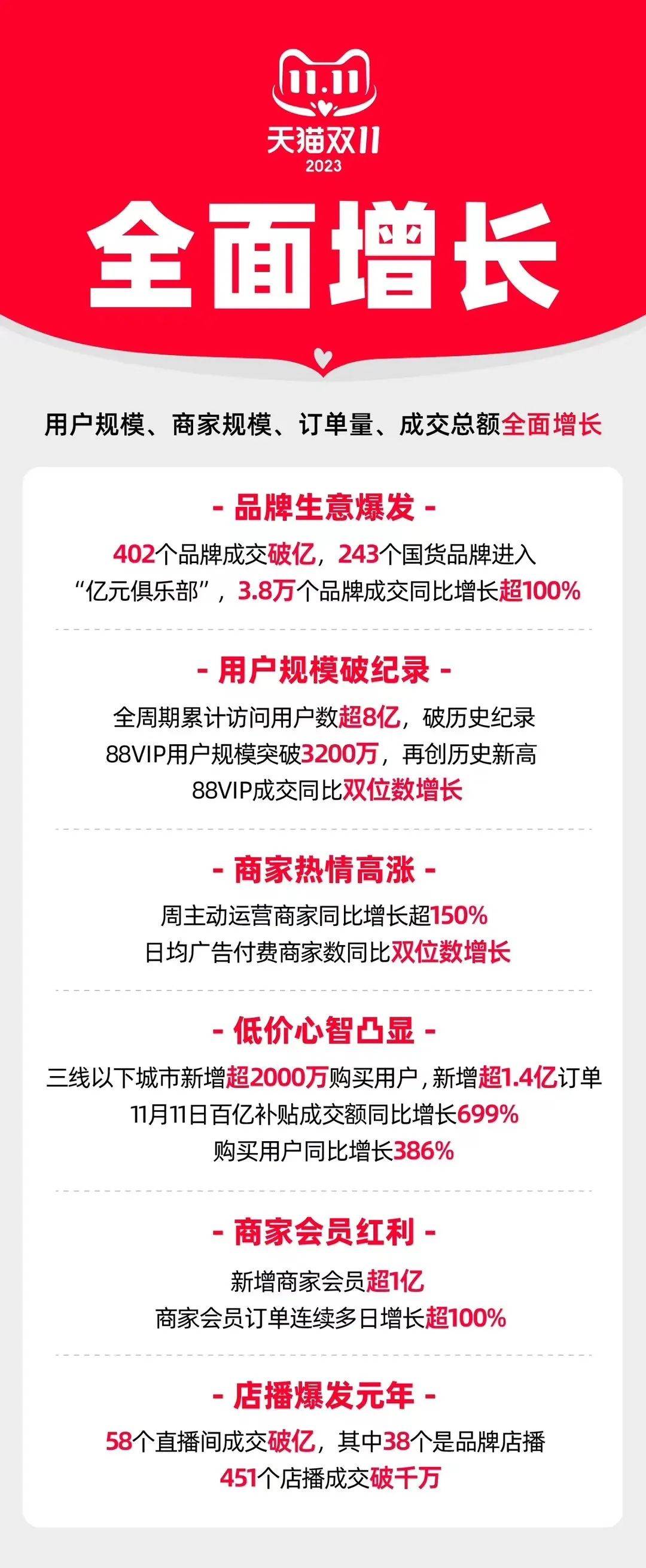 同时,在官方立减、满减等玩法支持下,品牌商的集体让价获得了实效。截至11月11日零点,淘天平台上共有402个品牌成交破亿,成交额比去年同期增长超过100%的品牌有3.8万个。
