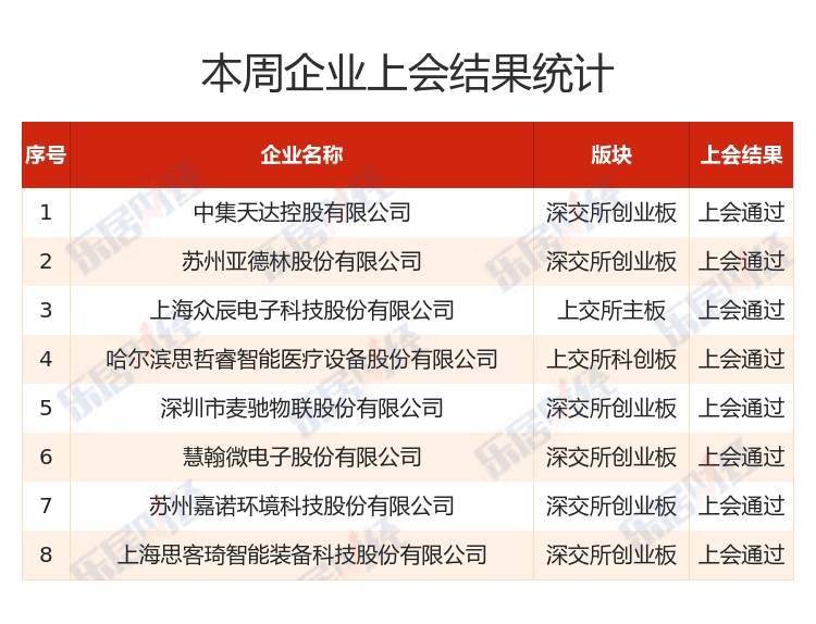 本周上会企业8家,其中主板1家,科创板1家,创业板6家。预计下周有9家企业上会,其中主板3家,科创板1家,创业板5家。