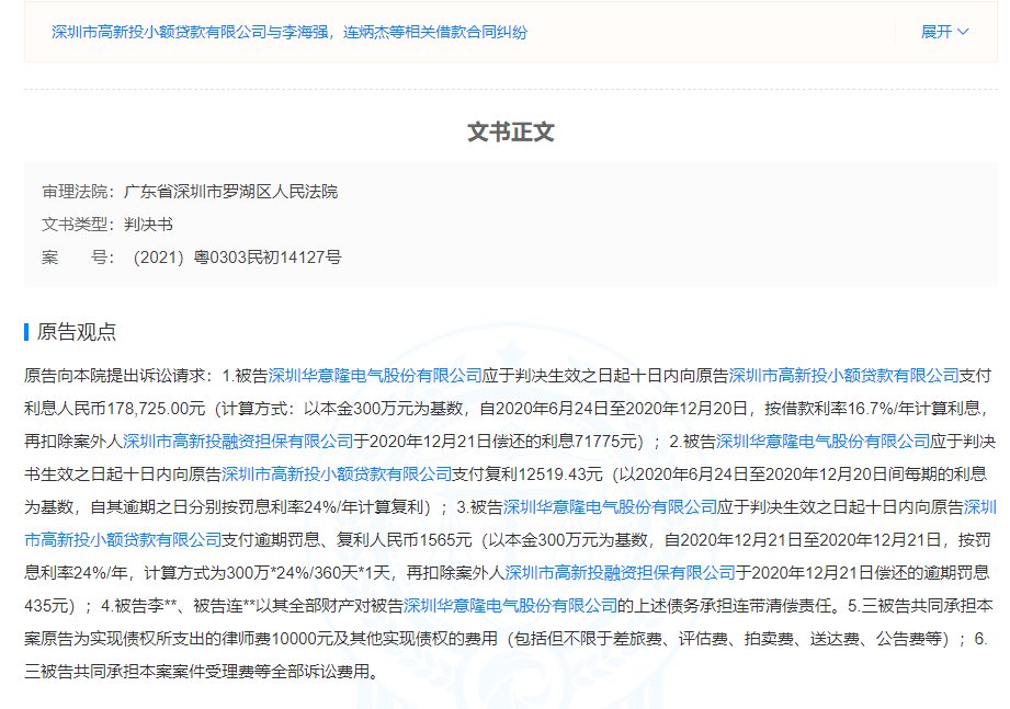 此外,根据公开资料,实际控制人此次进行质押的目的是为了满足融资需求。通过查询天眼查平台,我们发现此次质押的质权人为深圳市高新投小额贷款有限公司。根据该公司的法律判决书,我们可以了解到其借款利率普遍维持在16.7%。考虑到翰宇药业此次质押融资的目的,即使正常质押其融资成本应该不低。从一定程度反应其实控人存在现金流紧张情况。