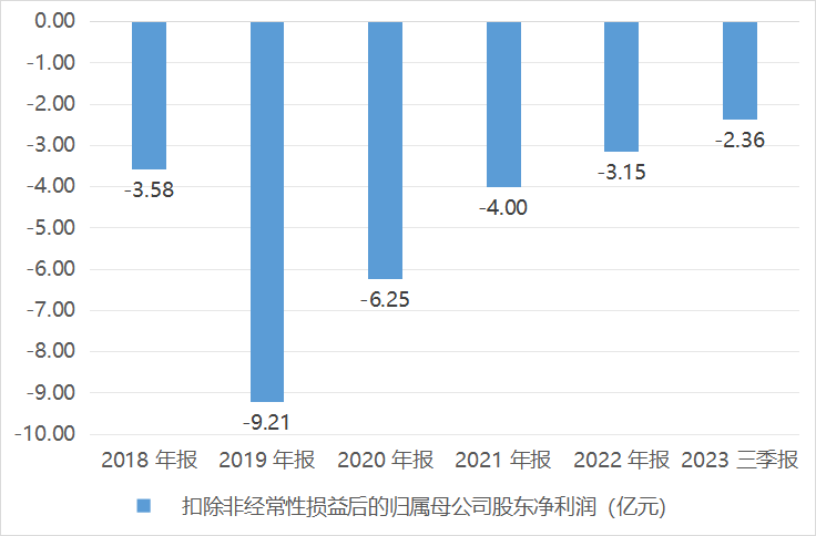 数据显示,2018年以来,翰宇药业的归母净利润累计亏损超20亿,扣非归母净利润累计更是接近30亿。具体来看,2018-2022年末以及2023年9月末,翰宇药业归属于上市公司股东的扣除非经常性损益的净利润分别为-3.58亿、-9.21亿、-6.25亿、-4.00亿、-3.15亿以及-2.36亿。