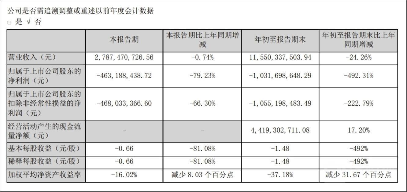 10月29日,发布2023年第三季度公告,报告期内,公司实现营业收入约27.87亿元,同比减少0.74%;归母净利润约-4.63亿元,同比减少79.23%;扣非净利润约-4.68亿元,同比减少66.3%。