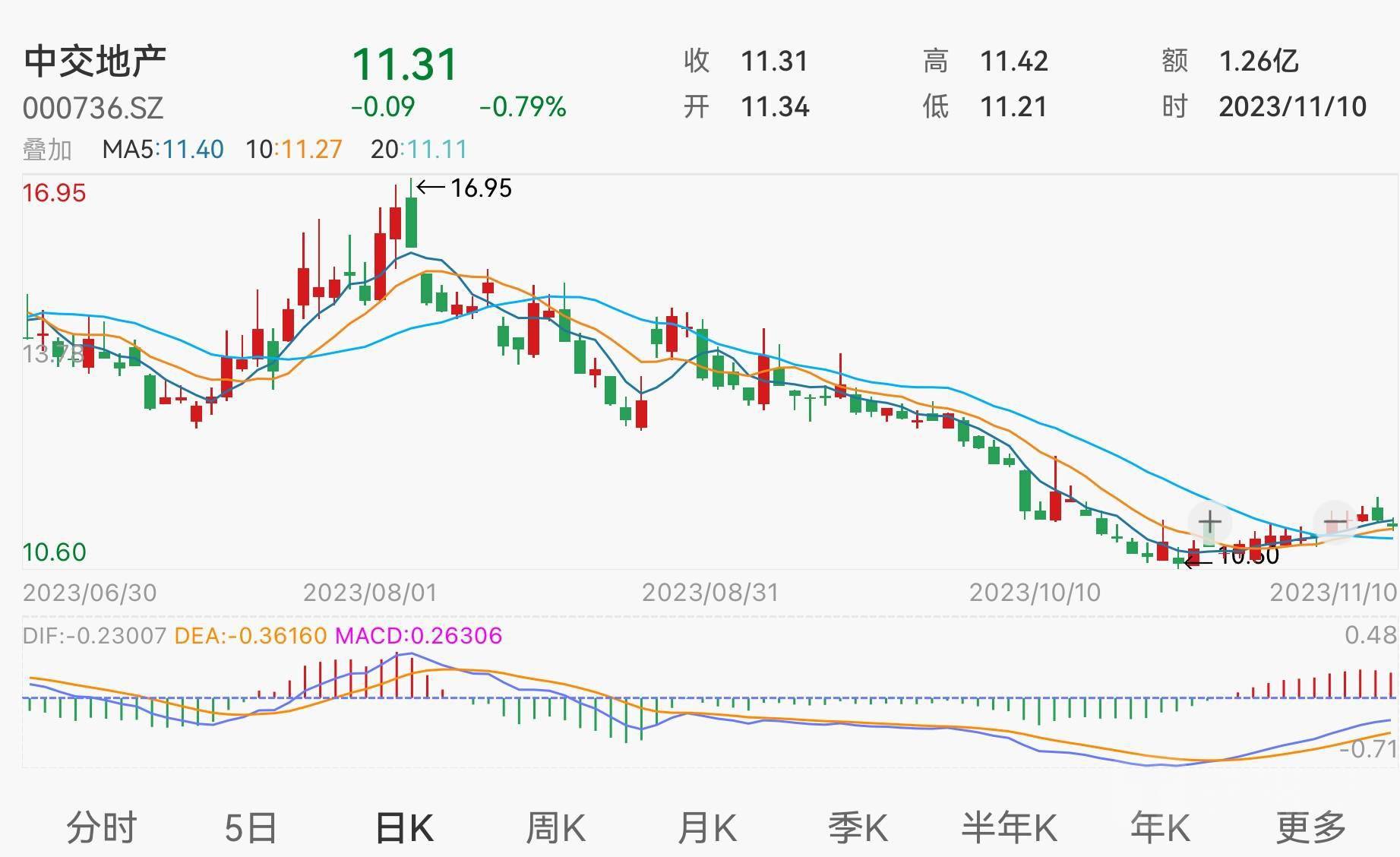 或是受到诉讼案件带来的负面影响,二级市场方面,上述两家A股上市公司的股价皆有不同程度的下滑走势。截至11月10日收盘,原告方中交地产股价报收11.31元,微跌0.79%,成交额为1.26亿元,当前公司总市值约78.65亿元。