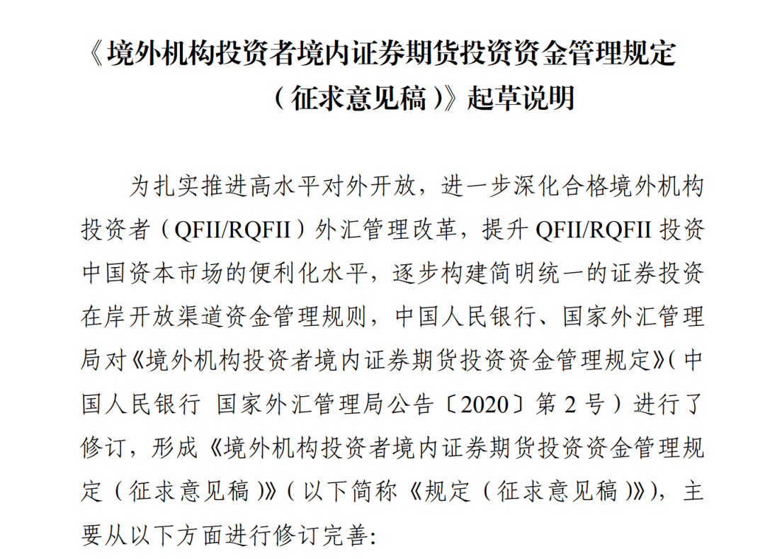 2020年5月,中国人民银行、国家外汇管理局制定了《境外机构投资者境内证券期货投资资金管理规定》。同年9月25日,经国务院批准,证监会、中国人民银行、国家外汇管理局发布《合格境外机构投资者和人民币合格境外机构投资者境内证券期货投资管理办法》,降低准入门槛,扩大投资范围,加强持续监管。