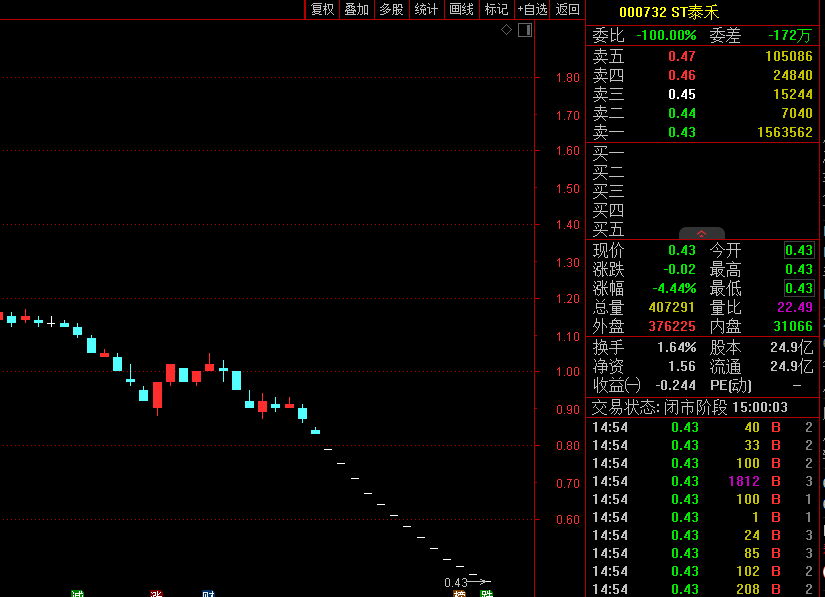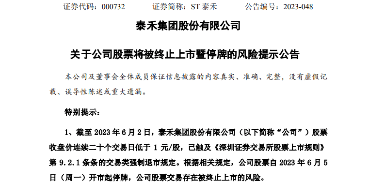6月2日晚间,ST泰禾(000732)公告称,截至当日,公司股票收盘价连续二十个交易日低于1元/股,触及交易类强制退市规定。