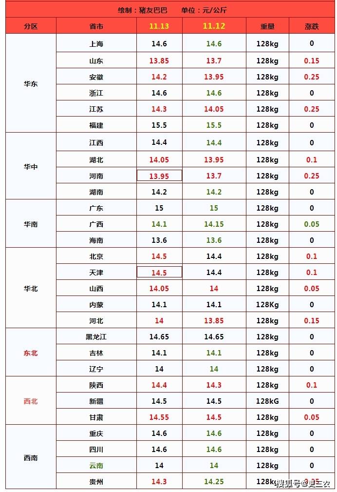 从市场反馈来看,11月13日,猪价呈现震荡偏强的走势,国内南北地区,猪价上涨范围增多,北方地区,猪价震荡偏强,南方市场以弱稳调整为主!从分区反馈来看,目前,全国生猪价格在13.6~15.5元/公斤左右,其中,海南、山东、河南地区,猪价不及14元/公斤,山西、河北、湖北、安徽等地,市场低价补涨明显,价格涨破14元/公斤,南北主流地区,生猪报价在14~14.6元/公斤左右,区域猪价缺乏明显的价差,高价地区,福建以及广东报价横盘在15~15.5元,浙江以及上海报价在14.6元/公斤!