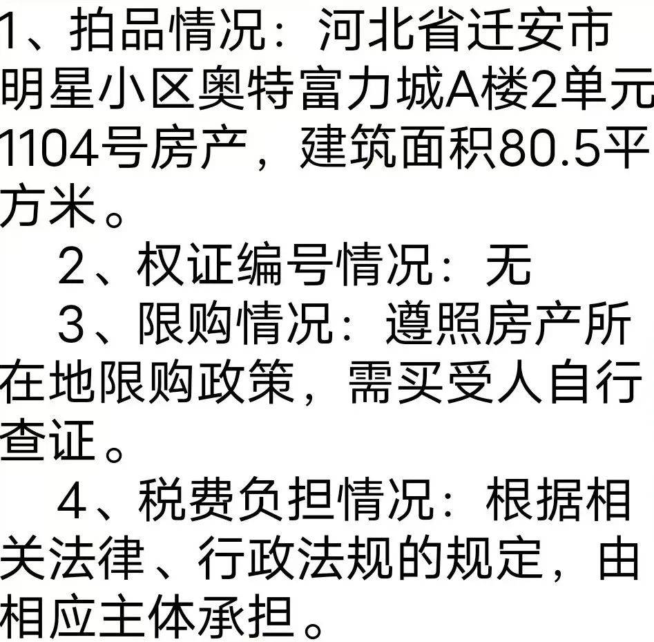此次的拍品为迁安市明星小区奥特富力城A楼2单元1104号房产,权利来源司法裁定,房屋用途及土地性质为住宅用房、出让,无租赁、无钥匙,本次拍卖为第一次拍卖,拍卖时间2023年12月6日10时至2023年12月7日10时止(延时的除外),展示看样时间2023年11月20日至2023年11月22日。