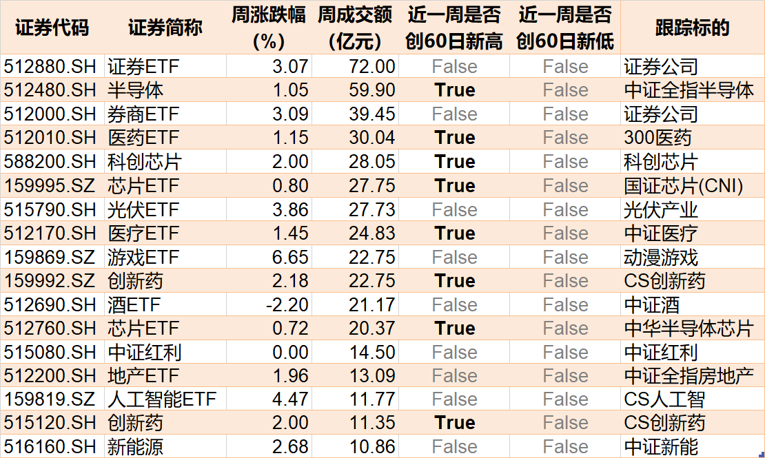 成交额靠前的有跟踪证券公司的证券ETF、券商ETF,以及跟踪中证全指半导体的半导体ETF,周成交额而分别为72亿元、39.45亿元和59.9亿元。