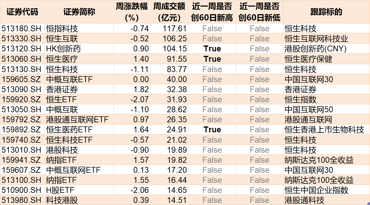 跨境ETF本周成交额超过10亿元的有18只,其中恒指科技、恒生互联、HK创新药周成交额突破100亿元。
