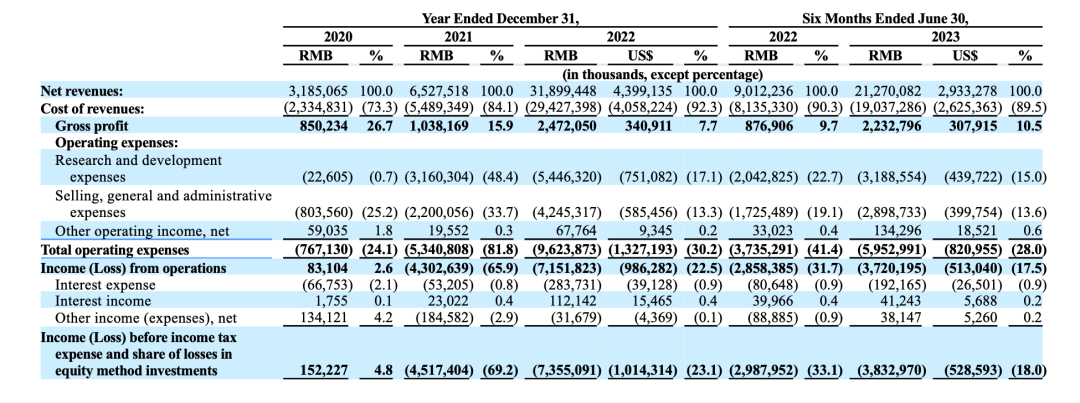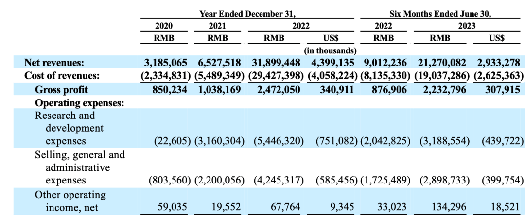 招股书显示,2020年至2022年,极氪汽车营收分别为31.85亿元、65.28亿元和318.99亿元;净利润分别为1.04亿元、-45.14亿元和-76.55亿元,三年累计亏损超120亿元;毛利分别为8.5亿元、10.38亿元、24.7亿元。