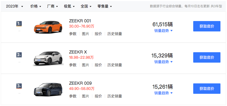 作为吉利向新能源转型的重要品牌,截至目前,极氪汽车共有极氪001、极氪009、极氪X三款在售车型。乘联会零售数据显示,2023年1-10月,极氪汽车累计交付92105辆新车,其中极氪001是主要销量来源,累计销量为61515辆,占极氪总销量的66.79%;而极氪X为15329辆;而极氪009为15261辆。