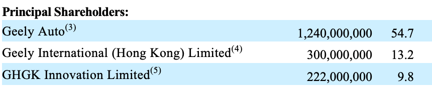 极氪汽车在招股书中表示,自成立以来,吉利汽车一直是控股股东,并将在本次发行完成后继续控制极氪。招股书显示,在本次发行前,吉利汽车持股54.7%;吉利国际(Geely International (Hong Kong) Limited)持股13.2%;GHGK Innovation Limited持股9.8%。