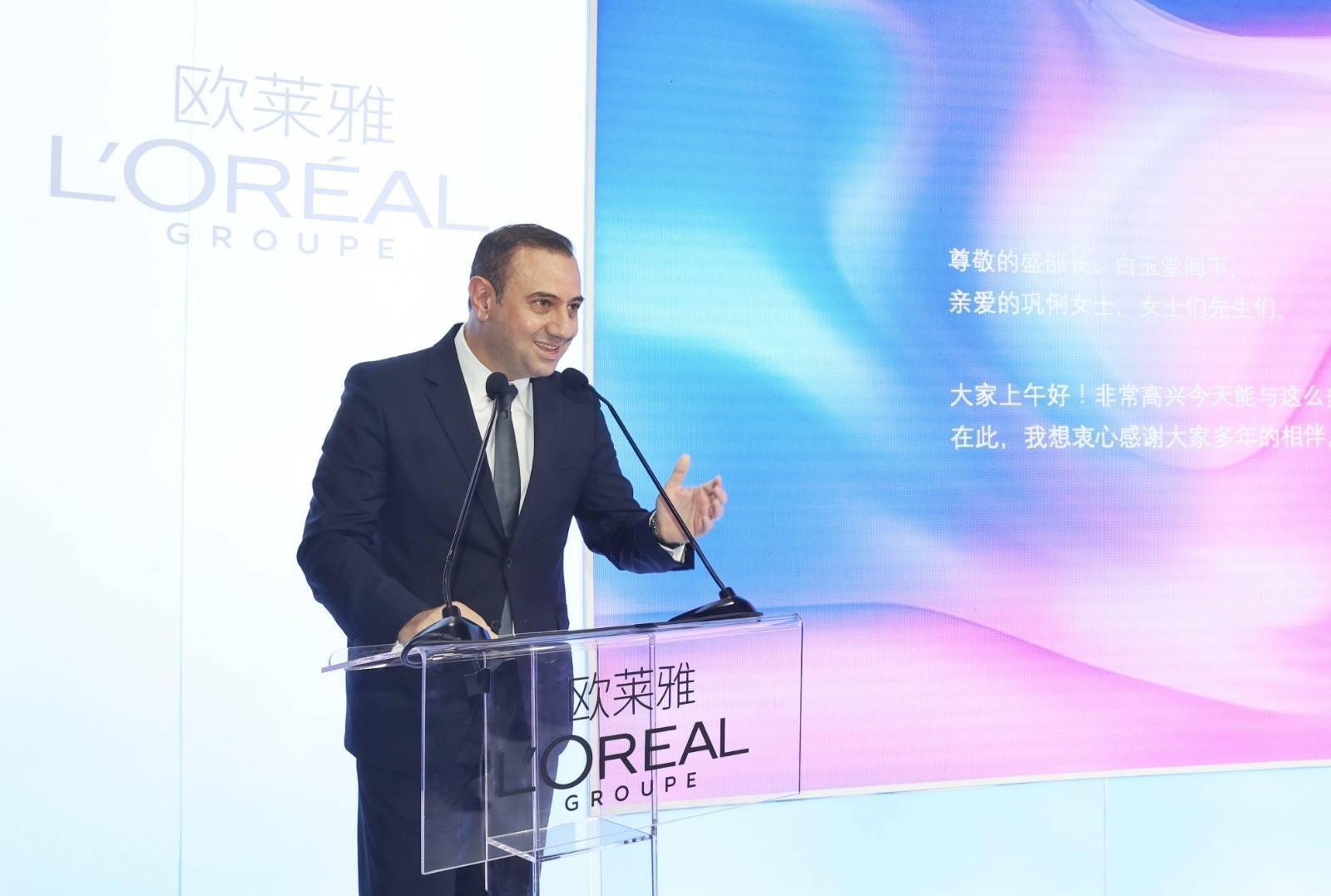 费博瑞在欧莱雅展台发言。(图片由受访者提供)