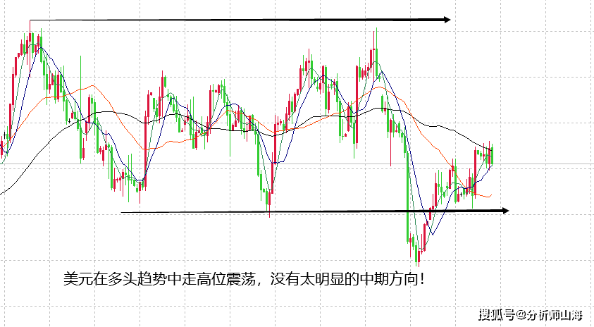 美元上周在下跌回落至104.6后就开始上涨,经过本周的反复震荡,最终走出慢涨空间,目前收盘在105.7附近,按照这个走势,预计本周美元波动不会很大,还是延续多头趋势看慢涨空间,上方关注107的高点得失,下方关注104.5的支撑,不管是先涨后跌还是先跌后涨,大概率不会逃脱此区间。大家可以看到,近期美元的走势跟黄金的走势相关性不大,甚至大多数有同涨同跌的状态,所以,周内做贵金属也不用对比美元的走势,重点参考一下地缘局势变化,美联储政策问题。