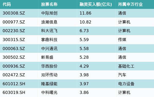6月29日,两市共有3189只个股有融资资金买入,其中中际旭创、浪潮信息、科大讯飞排名前三,买入金额分别11.86亿元、10.82亿元、6.73亿元。融资买入额前10个股详情见下表: