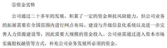 关于公司竞争劣势,明喆集团在申报稿中表示,公司业务的拓展需要在全国范围内进行网点布局、建设与升级信息化系统以及进一步完善人力资源建设等,因此需要大规模的资金投入。公司亟需通过进入资本市场实施股权融资等方式,补充公司业务发展所必须的资金。