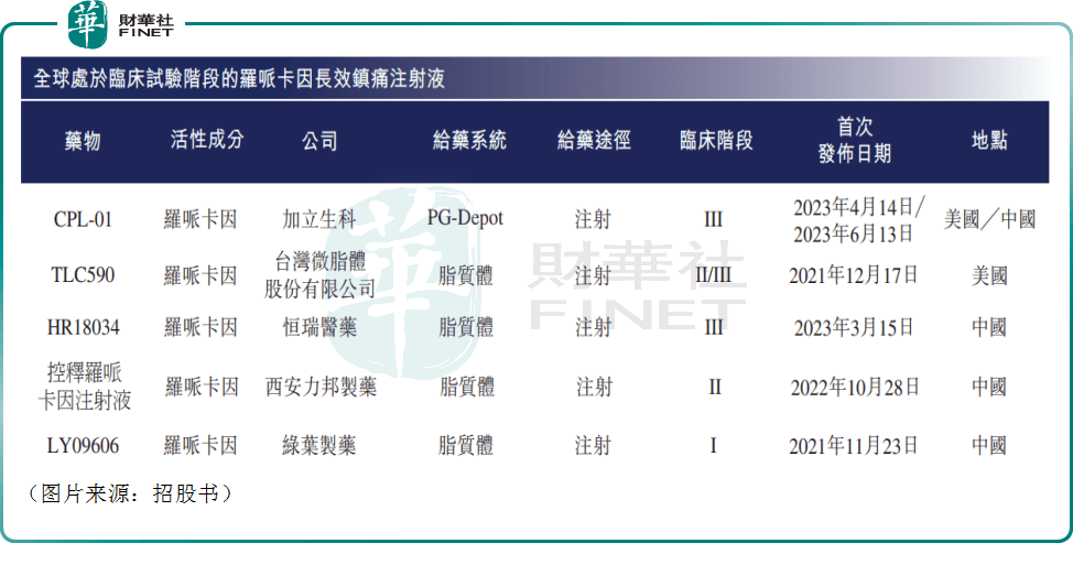 术后镇痛市场的主要治疗选择包括(其中包括)局部麻醉剂、乙酰氨基酚及非甾体抗炎药物(NSAID)以及阿片类药物。根据弗若斯特沙利文的资料,截至目前,全球尚无获批准的罗哌卡因长效注射液,且CPL-01是全球处于临床试验阶段的五款罗哌卡因长效镇痛注射液候选药物之一。