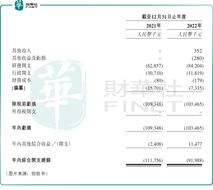 数据显示,2021年、2022年,该公司的其他收入分别为0、35.2万元(如非特指,以下元均指人民币),年内亏损分别约为1.09亿元、1.03亿元。
