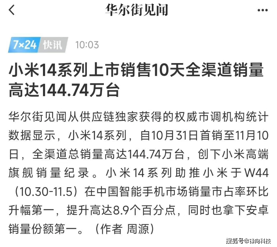 这不11月13日来自权威媒体“华尔街见闻”的消息就证实了小米14销量过百万是真实存在的。报道称他们独家从供应链获得权威市调机构的统计数据。这个统计数据显示小米14系列,10月31日开售至11月10日期间,全渠道总销量高达144.74万台,创下小米高端旗舰销量纪录。