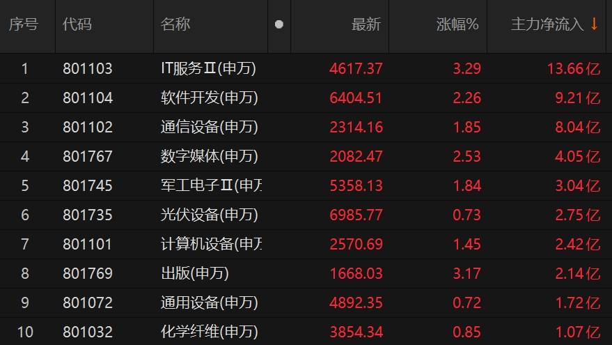 2023年11月13日,今日A股早盘主力资金前十板块,申万二级分类显示共计净流入48.10亿元,其中IT服务、软件开发、通信设备主力净流入前三,分别净流入13.66亿元、9.22亿元、8.04亿元。以上信息不构成投资建议。