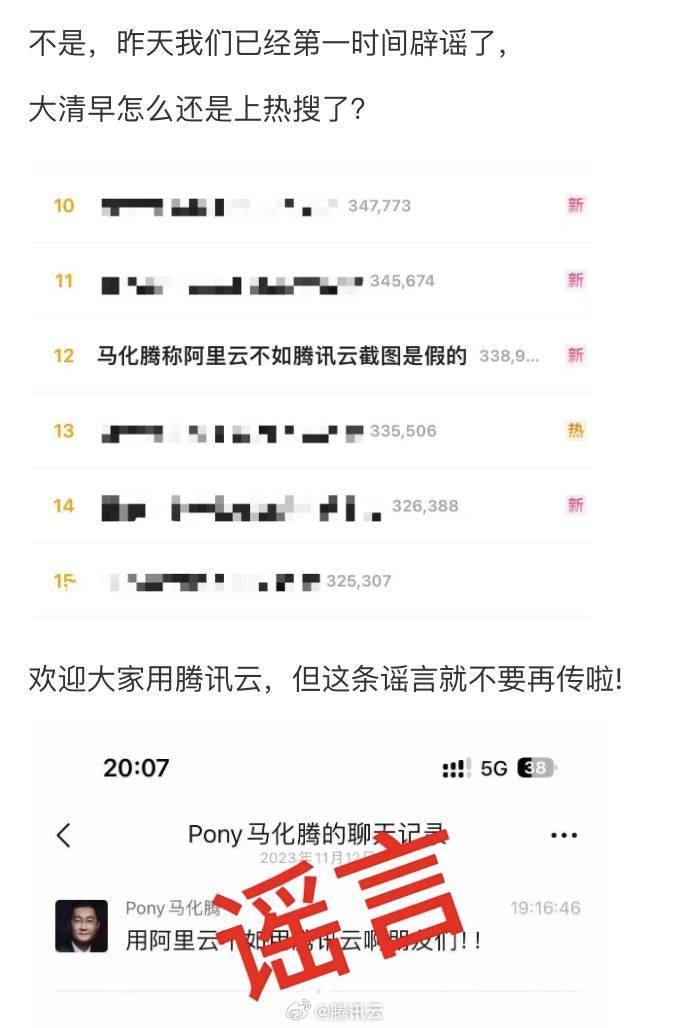 原标题:马化腾称阿里云不如腾讯云上热搜 腾讯:言论不实