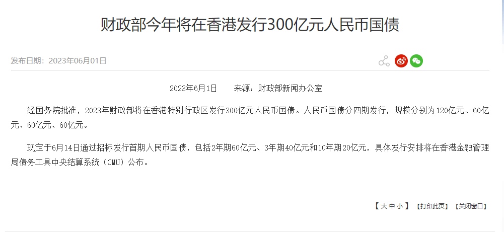 据财政部网站,经国务院批准,2023年财政部将在香港特别行政区发行300亿元人民币国债。人民币国债分四期发行,规模分别为120亿元、60亿元、60亿元、60亿元。现定于6月14日通过招标发行首期人民币国债,包括2年期60亿元、3年期40亿元和10年期20亿元,具体发行安排将在香港金融管理局债务工具中央结算系统(CMU)公布。