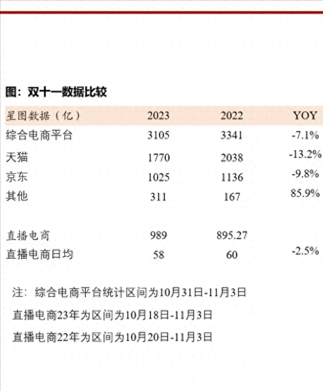 但平台没有公布总交易额,根据星图数据透露的2023年双十一各综合电商平台数据来看,2020年4982亿,2021年6000亿,2022年5571亿,2023年3105亿。同比往期战绩,掉的太厉害,从消费者的感受来看,这一届双十一,是非常惨淡的一届。