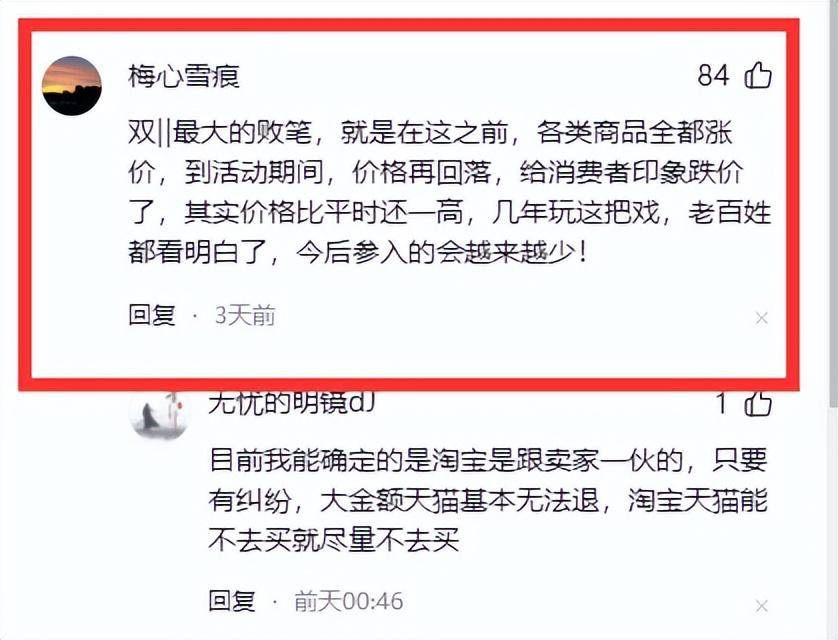 有网友表示:双十一最大的败笔,就是在这之前,各类商品全部涨价,到活动期间,价格再回落,其实价格比平时还高。几年来一直玩这把戏,老百姓都看明白了,今后参与的人会越来越少。