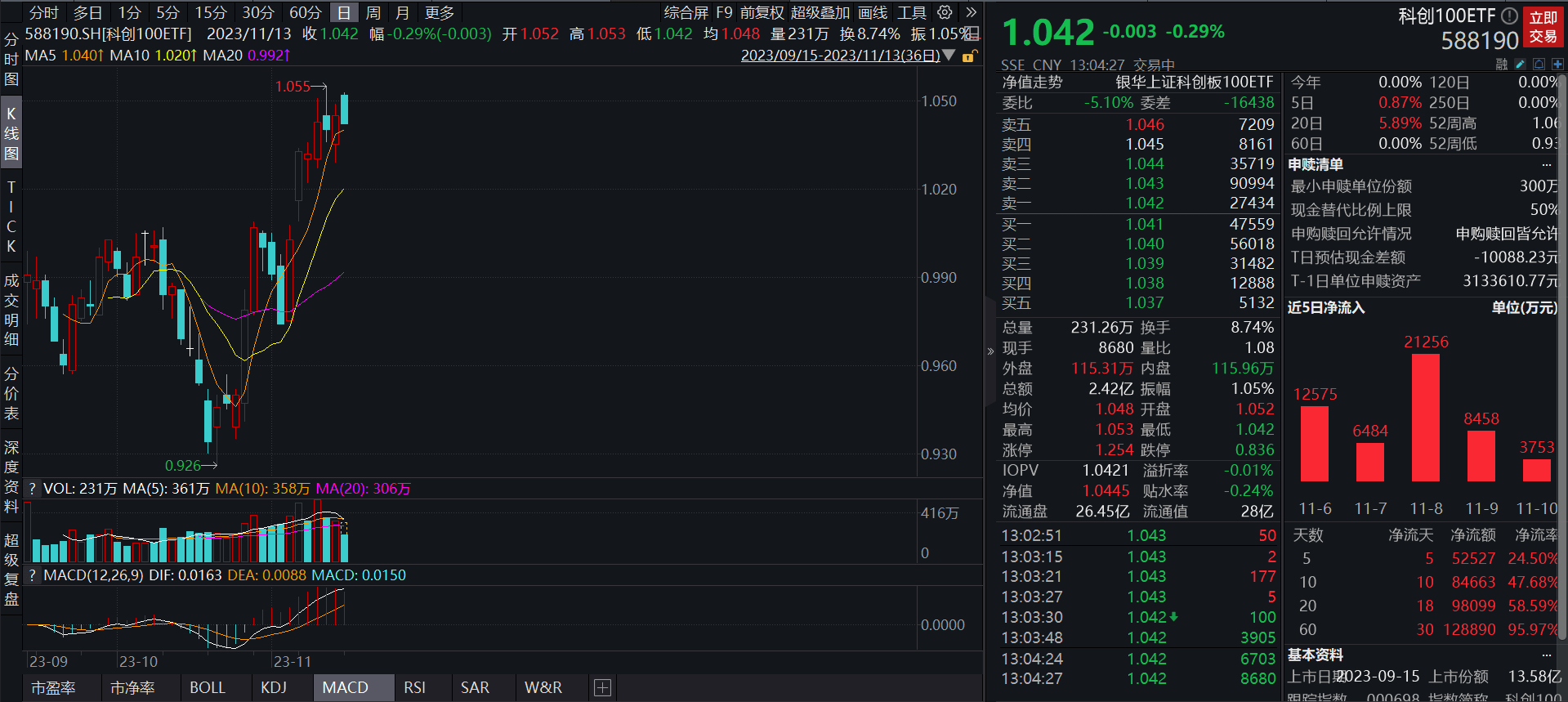截至2023年11月13日13:04,科创100ETF(588190)午后开盘持续震荡,回调0.29%,报1.042元,成交额达2.42亿元,市场资金持续关注。