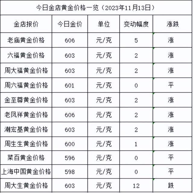 今天是11月13日,金店黄金价格继续上涨,涨得不多,虽然刚过去的周末里金价出现下调,但整体金价还是非常高,维持在600元/克之上。目前,金价最高的金店还是为老庙、老凤祥,涨幅分别为5元/克、2元/克,报价606元/克。而金价最低的金店依旧为菜百,同样不涨不跌,报价596元/克。今日黄金价格高低差为10元/克,价差较大。
