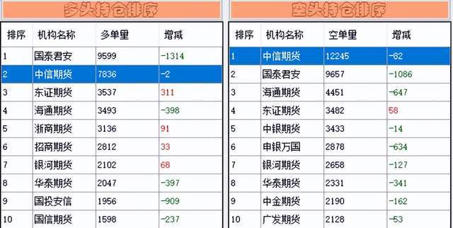 先来看下对下一个交易日有预判作用的“神器”——中信期货在股指期货上的增减持情况。它在沪深300股指期货上多单方面减仓2手,空单方面减仓82手,给出了“偏多”的信号——预判失误。