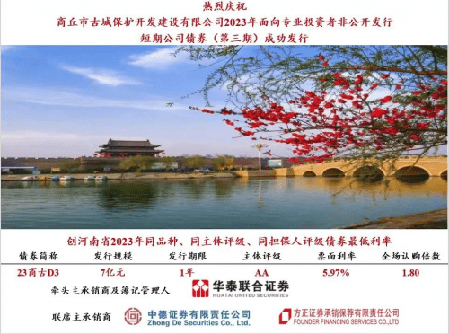 近期,中德证券有限责任公司(以下简称:中德证券)作为联席主承销商成功完成了商丘市古城保护开发建设有限公司2023年面向专业投资者非公开发行短期公司债券(第三期)的发行工作。本期债券的发行规模为7亿元,债券期限为1年期。发行人主体评级为AA,本次债券债项评级为A-1。票面利率为5.97%。本期债券的发行利率创河南省2023年同品种、同主体评级、同担保人评级债券最低利率。