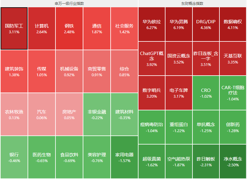 分行业来看,国防军工、计算机、钢铁、通信、社会服务等行业领涨,家用电器、美容护理、食品饮料、医药生物、银行等行业领跌,其中华为算力、鸿蒙表现最强。