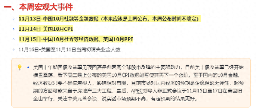 本周是重磅宏观数据周,首先是央行本应在上周公布的金融数据,周二晚上美国将公布10月份CPI数据,周三我国将公布10月份社零等经济数据,周三晚上美国将公布10月份PPI数据。除了以上重磅宏观数据外,APEC领导人非正式会议于11月15日至17日在美国旧金山举行,这更是头等大事,这些事件我们都在盘前的《古东投研》给大家列示出来了,并做了简单的分析。